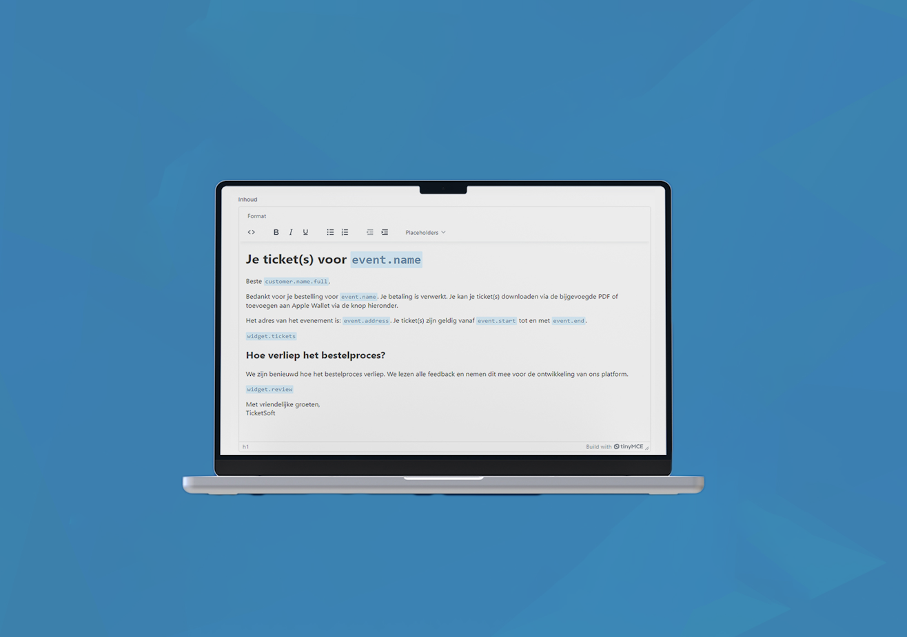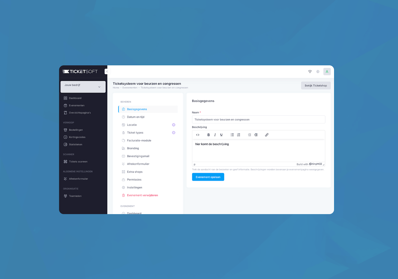 Geef je ticketshop een professionele uitstraling. Voeg logo’s, kleuren en teksten toe, zodat de verkoop van tickets volledig aansluit bij jouw beurs of congres.