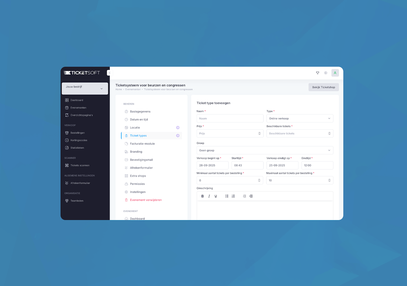 Start vandaag nog gratis!Ja, met TicketSoft kun je verschillende soorten tickets aanbieden, zoals VIP-kaarten, early bird-tickets, dagkaarten of passe-partouts. Dit geeft bezoekers de vrijheid om een ticket te kiezen dat bij hen past. Omdat deze functie standaard onderdeel is van het ticketsysteem voor beurzen en congressen, blijft de ticketverkoop overzichtelijk en professioneel. Zo speel je flexibel in op de behoeften van je doelgroep en verhoog je de kans op een succesvolle verkoop.