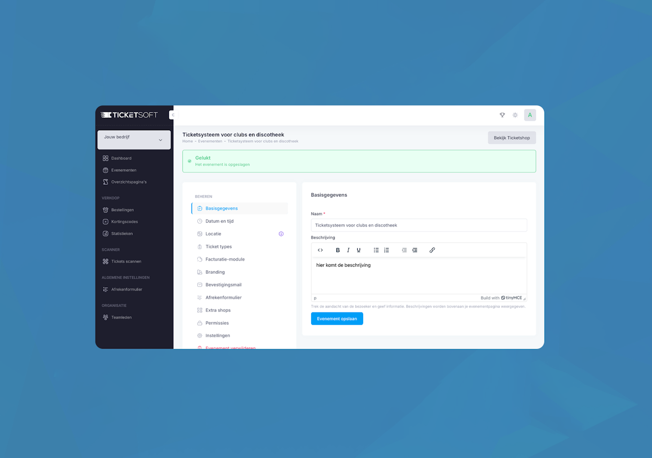 Start gratis met ticketsysteem voor discothekenGeen club of discotheek is hetzelfde. Daarom biedt TicketSoft een flexibel ticketsysteem voor clubs en discotheken dat volledig is in te richten naar jouw wensen. Denk aan koppelingen met CRM- of ledenbeheer, aangepaste ticketvelden of gepersonaliseerde bevestigingsmails. Ook de ticketverkoop clubs en discotheek en de ticketshop zijn volledig aanpasbaar in je eigen huisstijl. Zo sluit ons systeem altijd naadloos aan op jouw evenementen en groeit het mee met de bezoekersaantallen van je club of discotheek.