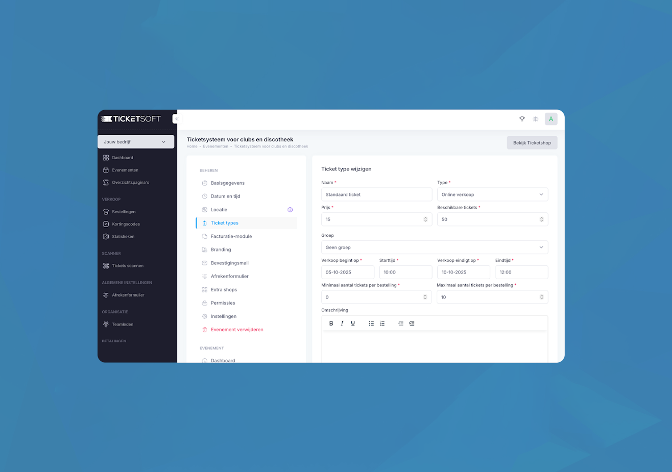 Start vandaag nog gratis!Ja, het ticketsysteem voor clubs en discotheken ondersteunt alle ticketsoorten die je nodig hebt. Stel eenvoudig early bird-tickets, VIP-kaarten, gastenlijst of groepskaarten in. Deze flexibiliteit maakt de ticketverkoop clubs en discotheken aantrekkelijker en overzichtelijker. In de clubs en discotheek ticketshop bepaal je zelf hoe de tickets worden gepresenteerd en welke periodes actief zijn. Zo wordt de online ticketverkoop clubs en discotheek niet alleen praktisch, maar ook een krachtig middel om je events beter te organiseren en meer bezoekers aan te trekken.